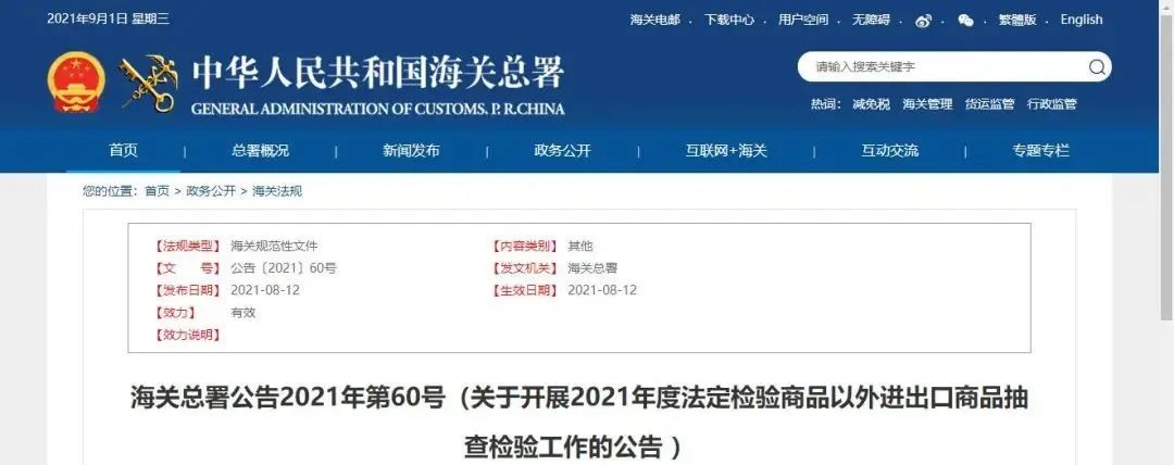 8月12日,海關總署發布2021年第60號公告,決定對2021年法定檢驗商品以外的部分進出口商品實施抽查檢驗,抽查檢驗的商品范圍涉及20類進出口商品,其中進口商品13類,出口商品7類。