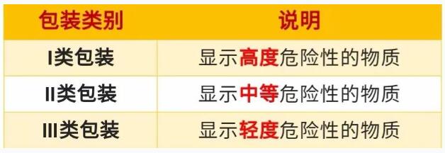 按照危險程度,對第1類、第2類、第7類、第5類的5、2項、第6類的6、2項以及第4類的4、1項自反應物質以外的其他各類危險貨物,可劃分為I類、II類、III類三個包裝類別: