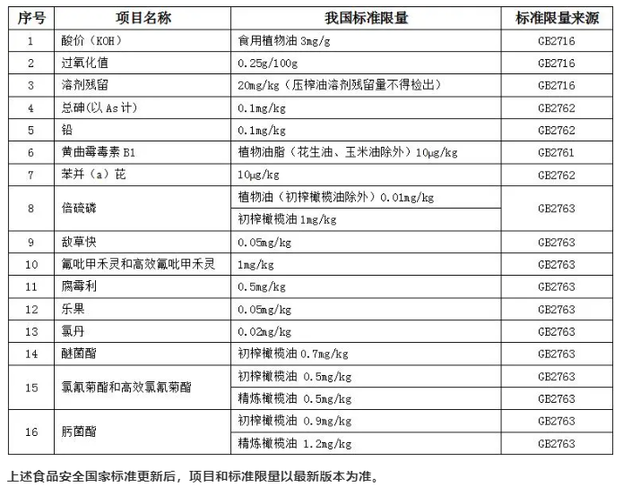 進口食用橄欖油食品安全衛(wèi)生指標(biāo)應(yīng)該符合現(xiàn)行的GB2716《食品安全國家標(biāo)準(zhǔn)植物油》、GB2761《食品安全國家標(biāo)準(zhǔn)食品中真菌毒素限量》、GB2762《食品安全國家標(biāo)準(zhǔn)食品中污染物限量》和GB2763《食品安全國家標(biāo)準(zhǔn)食品中農(nóng)藥最大殘留限量》等,現(xiàn)將部分相關(guān)衛(wèi)生指標(biāo)和強制指標(biāo)梳理如下: