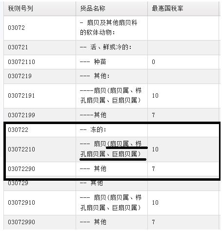 其中根據(jù)貨物不同的保存狀態(tài)(“活、鮮或冷的”“凍的”“其他”)歸入不同的二級子目項下,這點比較容易區(qū)分,如何選擇正確的本國子目則比較難以區(qū)分。以進口量最大的“冷凍蝦夷貝”為例,在日常申報實際中,03072210和03072290均有申報,兩者最惠國稅率分別為10%和7%,如果不能正確歸類,給海關監(jiān)管以及稅收征管都會帶來不利影響,企業(yè)也會面臨通關延誤、被后續(xù)稽查甚至處罰的風險。
